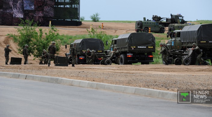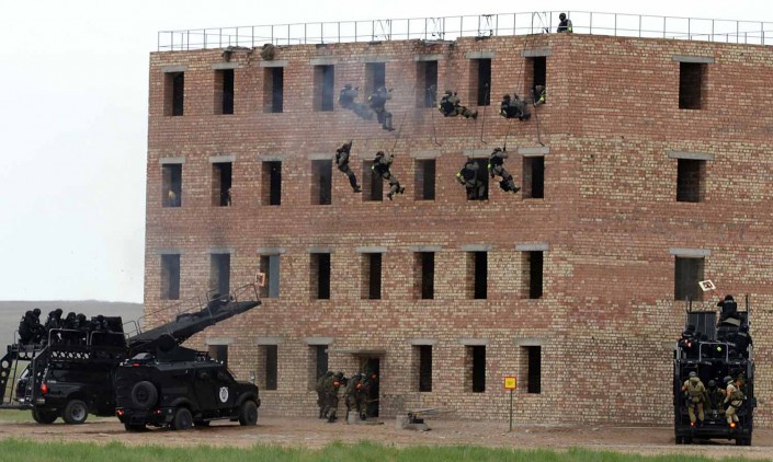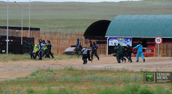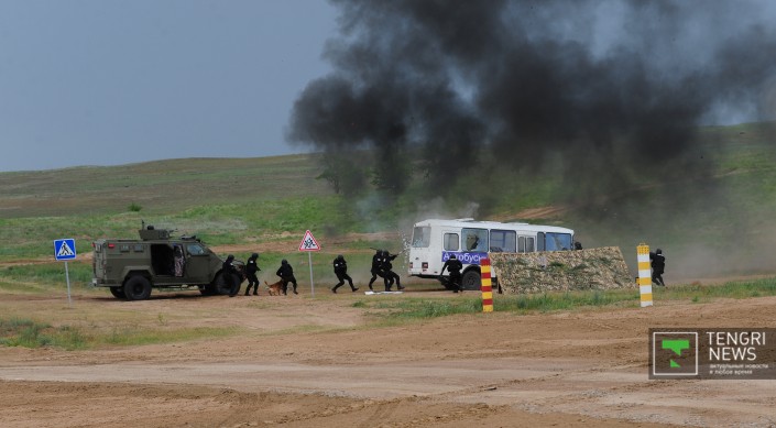 В Алматинской области прошли комплексные учения "Кайсар", в которых приняли участие несколько спецподразделений специального назначения силовых структур РК: "Қалқан" Службы государственной охраны, "Бүркіт" Национальной гвардии, "Сұңқар" министерства внутренних дел, "Арыстан" Комитета национальной безопасности, "Арлан" ДВД города Алматы и главного разведывательного управления министерства обороны.. Корреспондент Tengrinews.kz также побывал на учениях в поселке Заречный.