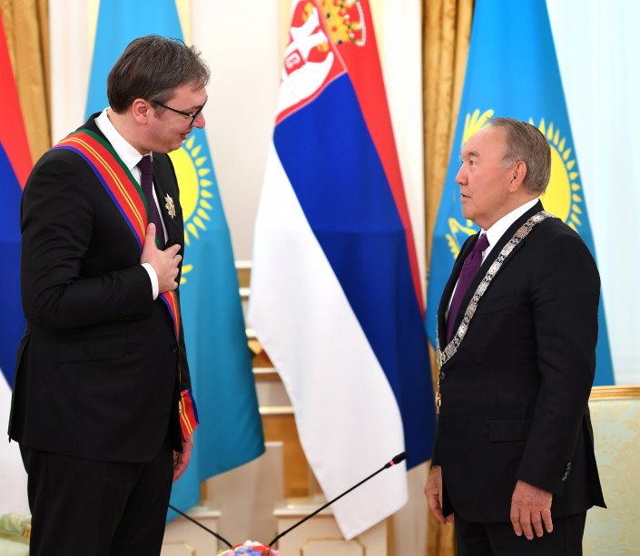 Назарбаев наградил Вучича Орденом "Достык" первой степени, а Александр Вучич вручил Главе государства "Орден Республики Сербия" первой степени.
