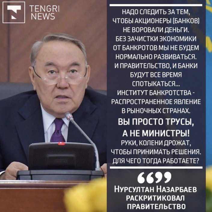 "Финансовая система... Создают банк. Люди начинают верить, приносят деньги. Квазигоссектор кладет деньги, а потом собственные акционеры начинают вытаскивать, воровать. Уходят, убегают, мы за ними потом... Данияр (Акишев, глава Нацбанка. - Прим. автора), головой отвечаешь. Надо следить за тем, чтобы акционеры не воровали деньги. А мы что сидим здесь? Это говорит о полной несостоятельности! Без зачистки экономики от банкротов мы не будем нормально развиваться. И правительство, и банки будут все время спотыкаться", - обратился к собравшимся Нурсултан Назарбаев в ходе расширенного заседания в Астане.