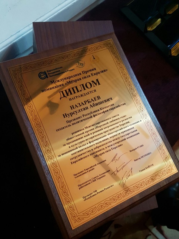 Премия "Народный любимец года" в новой номинации - "За вклад в продвижение идеи мира и сотрудничества на Евразийском континенте" - "Мудрая сила" - "Мудрая сила Евразии" присуждена Главе государства Нурсултану Назарбаеву.
