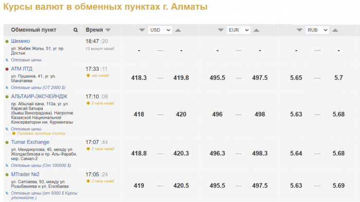 По данным kurs.kz, в настоящее время в обменных пунктах Нур-Султана доллар продают за 419,8-420,2 тенге, покупают - за 418-419,2 тенге, в Алматы обменники продают доллар по 419,8-420,5 тенге, покупают - за 418-419 тенге.