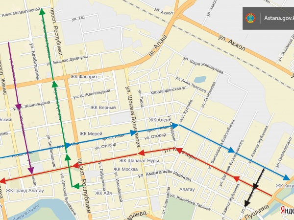 Согласно утвержденному плану, одностороннее движение появится сначала на улице Ауэзова (от проспекта Республики до улицы Алии Молдагуловой). Протяженность данного участка - 2,9 километра. И на улице Желтоксан (от улицы Московской до улицы Кенесары). Протяженность данного участка - 2 километра.