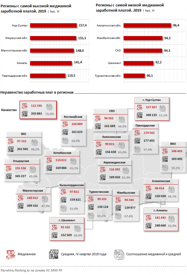 Напомним, что размер средней заработной платы в Казахстане по итогам последнего квартала 2019 года составил 203,9 тысячи тенге (плюс 15,8 процента за год в номинальном выражении), что практически в два раза превышает размер медианной. Поясним: чем больше разрыв между средней и медианной зарплатой, тем сильнее выражено неравенство в заработной плате и выше доля работников с низкой оплатой труда.