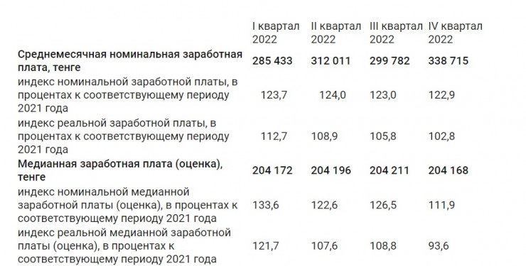 При этом медианное значение заработной платы (центральный уровень зарплатного ряда), по оценке, в ІV квартале 2022 года составило 204 168 тенге.