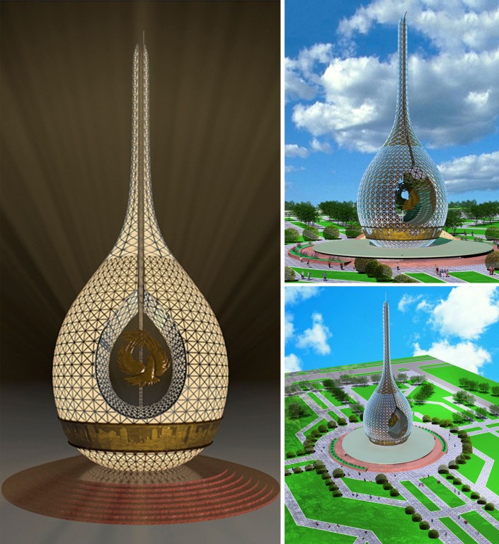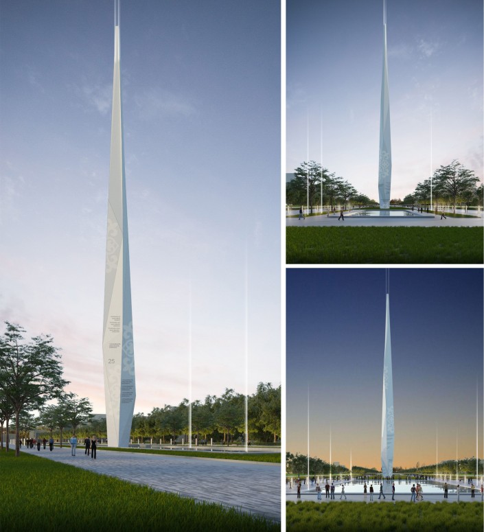 В выборе стилистического решения объекта использована универсальная и интернациональная форма строгой геометрической вертикали. А светло-серебристый цвет предлагаемого материала - титана - соответствует футуристическим горизонтам и трактуется как дальнейшее движение страны по пути созидания. Монумент, обращенный в небо, знаменует собой наши лучшие устремления и духовные порывы. Будущее всего мира - это вершины творческого духа.