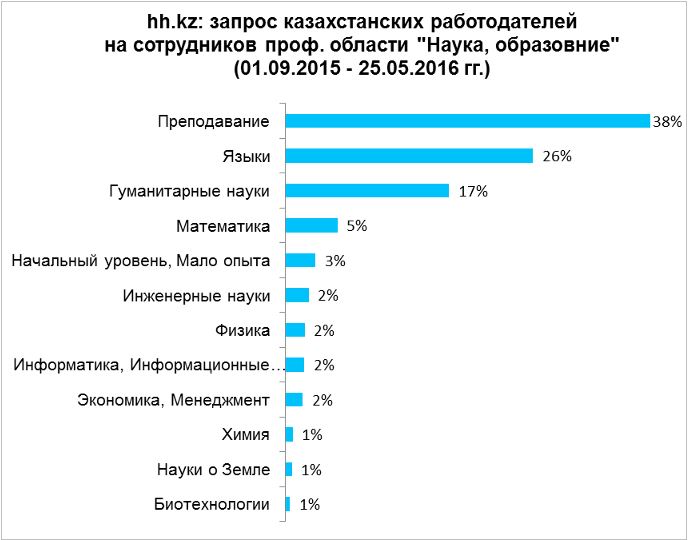 По их информации, повышенным спросом среди казахстанских работодателей пользуются работники науки и образования в специализациях: преподавание (38 процентов), языки (26 процентов), гуманитарные науки (17 процентов) и математика (5 процентов). Реже всего, по их словам, компании заинтересованы в преподавателях химии, наук о земле и биотехнологии (по 1 проценту вакансий от общего числа предложений работы в профессиональной области).