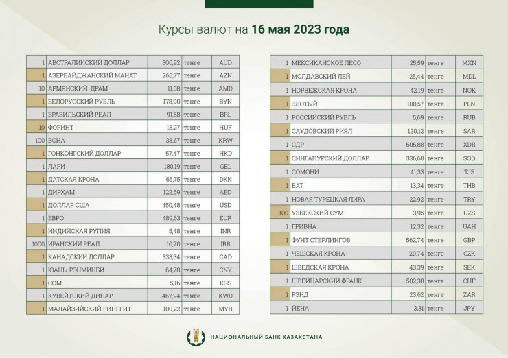 Национальный банк Казахстана опубликовал официальные курсы иностранных валют к тенге на 16 мая, передает Tengrinews.kz.