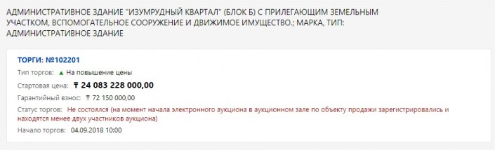 Начало торгов было запланировано на 10.00 часов 4 сентября. Как отмечается на электронной торговой площадке gosreestr.kz, на момент начала аукциона в аукционном зале по объекту продажи зарегистрировались и находились менее двух участников. Торги не состоялись.