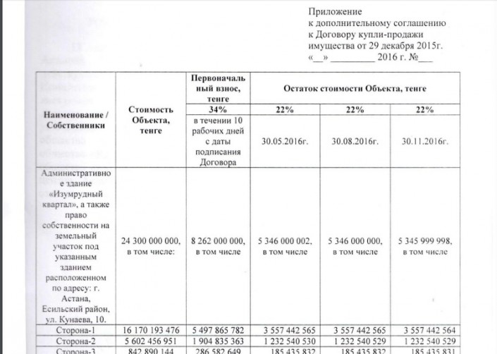 Общая стоимость объекта согласно документу равна 24,3 миллиарда тенге. Покупатель внес первоначальный взнос в размере 34 процента от общей стоимости (8 миллиардов 262 миллиона тенге). Остаток стоимости объекта был поделен равными долями на три части. Покупатель должен полностью расплатиться с КТЖ 30 ноября 2016 года.