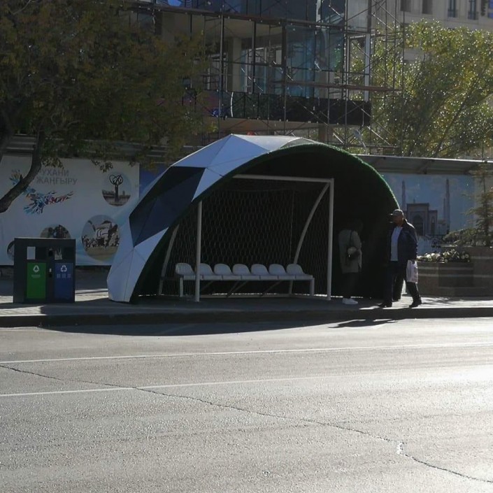 В одном из районов Астаны на днях появилась оригинальная остановка, которую наверняка оценят любители футбола. Об этом на своей странице в Facebook сообщила пресс-секретарь акимата района Сарыарка Бибигуль Абыддин.