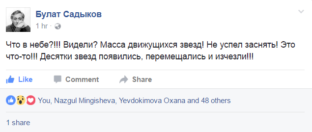 Напомним, ранее аналогичный инцидент произошел в Алматы в декабре 2014 года. Тогда в небе над городом также засняли огни. Комментируя инцидент, в Минобороны упомянули о запуске ракеты с "Байконура" в тот же день, когда необычное явление было зафиксировано. Однако между собой эти два события в министерстве не связывают. Как сообщили в ответе на официальный запрос Tengrinews.kz, с космодрома "Байконур" произвели запуск межконтинентальной баллистической ракеты РС-18, которая вывела на орбиту аппарат "Кондор-Э № 2". Запуск состоялся в 10.43 по времени Астаны 19 декабря. Это было за восемь часов до предполагаемого появления огней в небе над Алматы. Ракета взлетела в северном направлении с наклонением орбиты 74,9 и высотой в 500 километров.