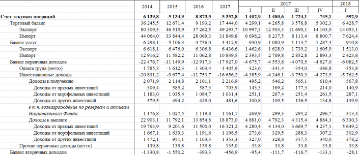 Отметим, что, как видно из таблицы Национального Банка, в первом квартале 2018 года счет текущих операций отрицательный.