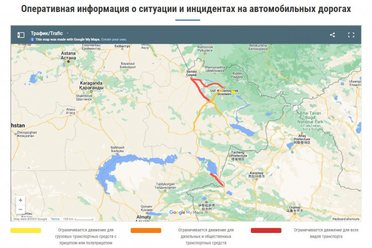 Для всех видов автотранспорта движение ограничено на автодорогах: Усть-Каменогорск - Семей, 10-198-й километры, участок село Герасимовка - Семей, а также Омск - Майкапчагай, 756-906-й километры, участок Семей - село Калбатау.