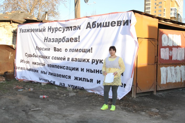 Эта цифра жильцов не устроила. Салимова, чтобы отстоять свое право на достойную компенсацию, попыталась привлечь внимание к своей проблеме с помощью большого плаката, адресованного Главе государства.