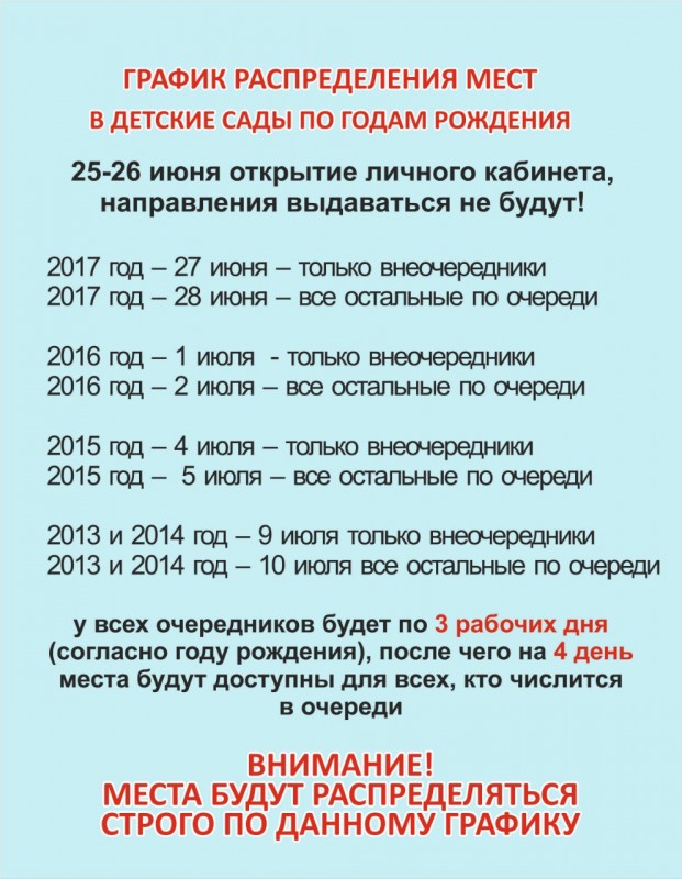 "С 25-26 июня мы откроем доступ в личные кабинеты, сейчас система недоступна. А направления начнут выдавать с 27 июня - для 2017 года рождения, с1 июля - 2016 год рождения, с 4 июля - для 2015 года. И 9 июля - для 2013 и 2014 годов рождения", - сообщил руководитель столичного управления образования Ануар Жангозин.