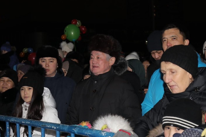Творческие коллективы городского Дома культуры исполнили праздничные новогодние песни и танцы. В праздничном мероприятии приняли участие аким Актюбинской области Бердыбек Сапарбаев и аким Актобе Ильяс Испанов. Они также пообщались с горожанами и поздравили их с праздниками.