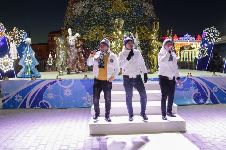 Почетная обязанность зажечь главную елку области была предоставлена победителю областных и республиканских конкурсов Шаймурат Бахтыгуль и заслуженному мастеру спорта РК по греко-римской борьбе Айдосу Султангали.