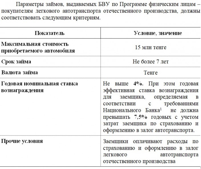 "Существенный рост произошел по кредитованию автомобилей отечественного производства за счет собственных средств банков - до 11 тысяч единиц (прирост на 65 процентов) на сумму 38,8 миллиарда тенге (прирост в 2,4 раза). Рост спроса на данную категорию кредитов происходит, несмотря на то что номинальная ставка вознаграждения по ним остается достаточно высокой, на уровне 13-26 процентов. Средневзвешенные ставки по выданным автокредитам БВУ варьируются в диапазоне 14-26 процентов", - говорится в документе.