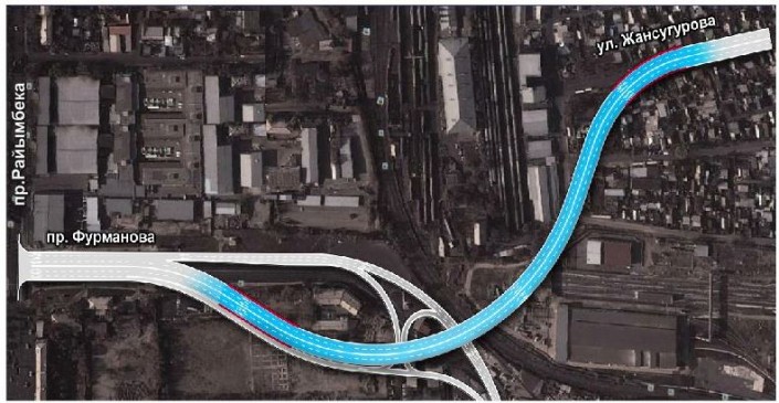 Также будет осуществлена пробивка улицы Фурманова до улицы Жансугурова с эстакадой через железнодорожные пути. Предполагается, что это позволит разгрузить центральную часть города на 20 процентов, благодаря созданию дополнительного транспортного коридора, связывающего центр с северными районами мегаполиса.