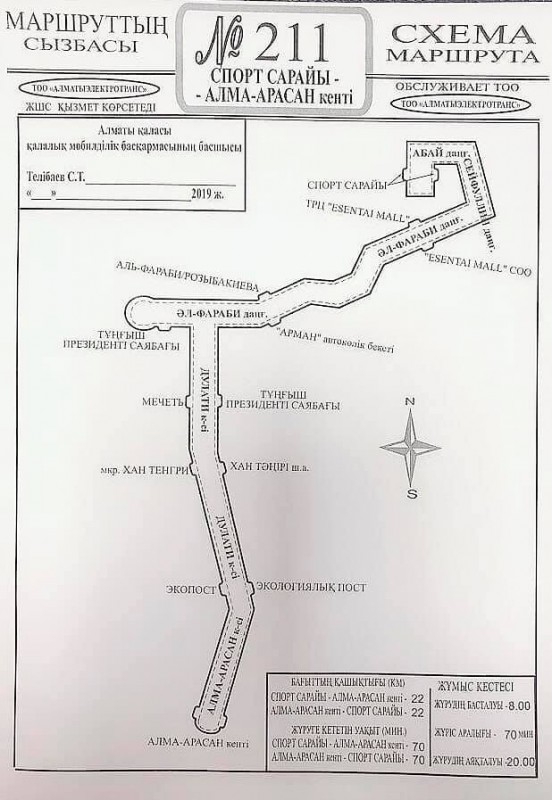 "С 12 июля образуется новый маршрут под номером 211 в количестве двух подвижных единиц. Начинает автобус движение от Дворца спорта и до Алма-Арасана с остановками согласно схеме маршрута. Курсировать автобус будет только в пятницу, субботу и воскресенье. Проезд составит 300 тенге.