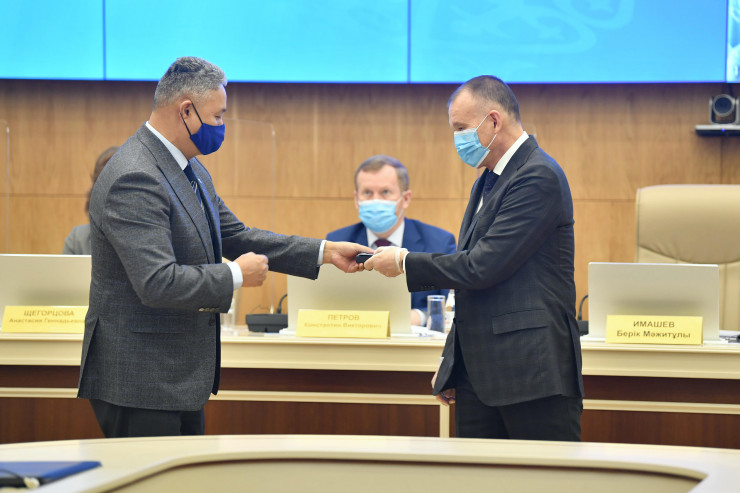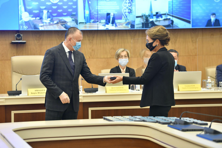 Председатель ЦИК Берик Имашев вручил удостоверения и нагрудные знаки зарегистрированным депутатам.