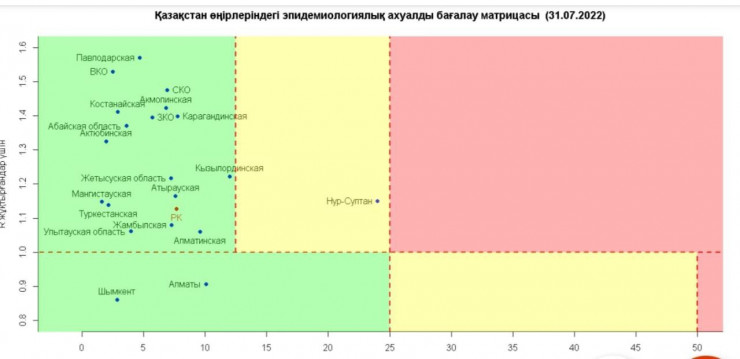 МВК опубликовала матрицу оценки эпидемиологической ситуации в регионах Казахстана на 31 июля 2022 года, передает Tengrinews.kz.