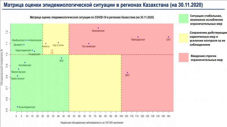 27 ноября министр здравоохранения Алексей Цой сообщал, что в зоне высокого риска, или "красной" зоне, где вводятся строгие ограничительные меры, остаются: Восточно-Казахстанская, Северо-Казахстанская, Павлодарская, Костанайская и Акмолинская области. В "желтой" зоне находится Алматы, остальные регионы - в "зеленой" зоне.