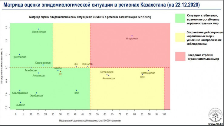 В "желтой" зоне находятся Нур-Султан, Акмолинская, Костанайская, Павлодарская, Западно-Казахстанская и Северо-Казахстанская области. Все остальные регионы - в "зеленой" зоне.