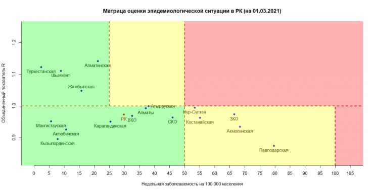 Сообщается, что, по данным на 1 марта, в "желтой" зоне находятся Нур-Султан, Акмолинская, Западно-Казахстанская, Костанайская, Павлодарская области.