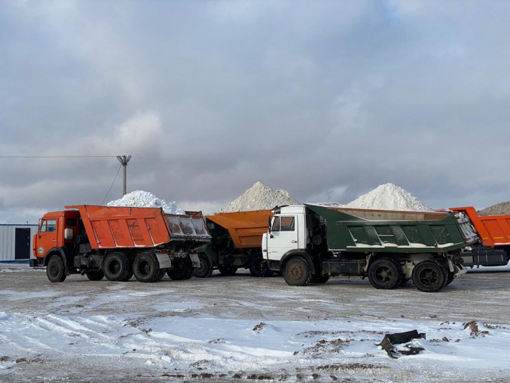 Обработка проезжей части городских дорог противогололедными материалами начинается сразу с началом снегопада.