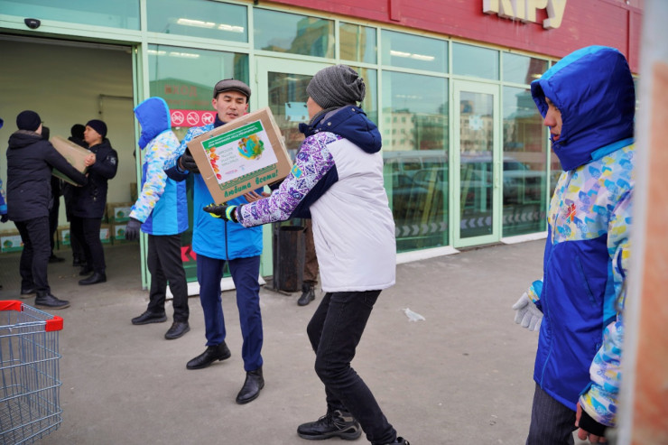 В Нур-Султане продолжается традиционная раздача продуктовых корзин нуждающимся семьям.