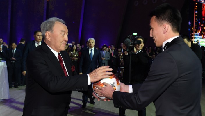 Футболисты вручили Назарбаеву мяч, который вывел "Астану" в 1/16 Лиги Европы. Именно этим мячом был забит решающий победный гол в ворота "Славии". Президент принял подарок от футболистов, устроив небольшую перепасовку с игроками "Астаны" и сборной Казахстана.