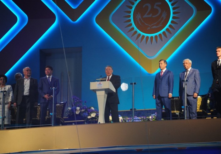 "1000-летний юбилей Алматы вместе с алматинцами отмечает не только Казахстан , но и все мировое сообщество. Эта историческая дата включена в календарь юбилейных дат ЮНЕСКО. И этим решением особо подчеркнута уникальная роль Алматы в региональном глобальном развитии. Священная земля у подножия седых вершин Алатау видела немало событий в своей большой истории, здесь проходил Великий Шелковый путь - первая торговая общечеловеческая магистраль, соединившая Восток и Запад, Север и Юг, огромную Евразию. 550 лет тому назад вся земля Жетысу стала большой колыбелью Казахского ханства. Здесь возник один из главных очагов уникальной урбанистической культуры всего региона Центральной Азии. Особую роль Алматы сыграл в ХХ веке. В 1929 году город принял эстафету казахстанских столиц и вырос до мегаполиса-миллионника. Алматы выпала честь быть первой столицей суверенного и независимого Казахстана. Поэтому символично что 1000-летие города мы все всенародно празднуем в год 25-летнего юбилея независимости нашей Родины", - сказал Нурсултан Назарбаев, выступая с речью.