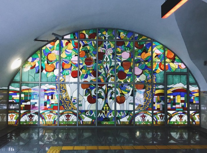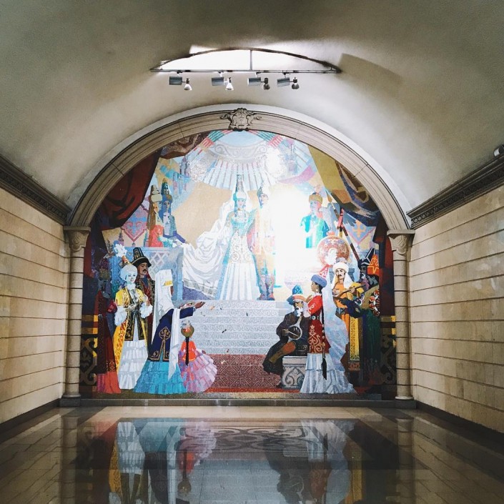 "Алматинское метро постепенно превращается в настоящий храм любви к городу. Помнится, когда его запустили несколько лет назад, там было совершенно неуютно: много места, пустота и холод. Прошло несколько лет, и алматинцы обжились под землей (как бы пугающе это ни звучало). Алматинцы вообще любят эти дела. Перестановку мебели сделать, добавить света, повесить картину с горами или акимом города. Так и на станциях метро: где-то появилась цветная стеклянная мозаика, где-то - вот такая фреска".