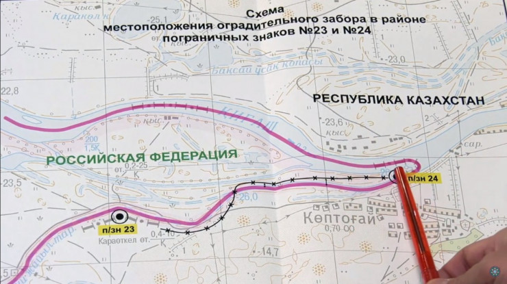 "Вопрос возник в том, что в 2008 году поставлен забор по просьбе самих жителей села Коптогай с тем, чтобы на территории Российской Федерации не осуществлялся перепас скота. Сейчас, как вы видите, мы хотели перенести, поскольку он оказался за линией границы, за серединой фарватера ерика Махамарский, между рекой и частью аула Коптогай. Выход к водопою, к реке Кегаш (Кигач) у местного населения имеется. Это порядка 150 метров правее. Она более глубокая и исключена возможность неумышленного перехода скота на территорию Российской Федерации", - добавил он.