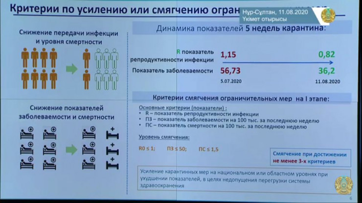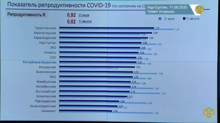 "На 11 августа картина показателей репродуктивности в регионах ниже единицы, кроме Туркестанской области, что еще раз подтверждает эффективность введенного карантина и принимаемых повсеместных мер по стабилизации ситуации.