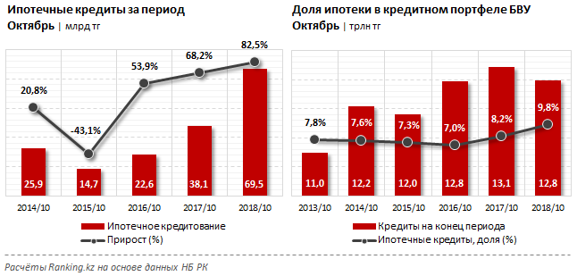 Ипотечное кредитование увеличилось на 82,5 процента за год: за октябрь текущего года объем банковских займов в секторе достиг 69,5 миллиарда тенге против всего 38,1 миллиарда тенге в аналогичном периоде годом ранее. Драйвером бурного роста ипотечных займов стала программа "7-20-25", стартовавшая 5 месяцев назад. За этот период было выдано займов на сумму 42,4 миллиарда тенге.