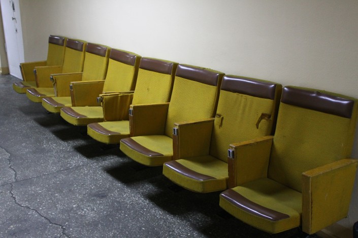"В этом зале совещались. Цвет стен был другой. Люстры те же. Красные кресла остались те же. Посредине стоял большой стол, который перенесли в другую аудиторию. Остался только маленький столик посередине. Столы мы списали, зачем мне они нужны? Сильно тяжелый стол, никто поднять не может, поэтому стоят внизу на складе. Еще здесь раньше была пальма у входа", - говорит Ирина Михайловна.