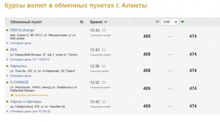 По данным Kurs.kz, на 12.50 курс продажи доллара в обменниках Алматы достиг отметки 474 тенге. Курс покупки - 469 тенге.