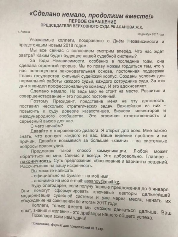 Обращение председателя Верховного суда Жакипа Асанова попало в Сеть, передает Tengrinews.kz.