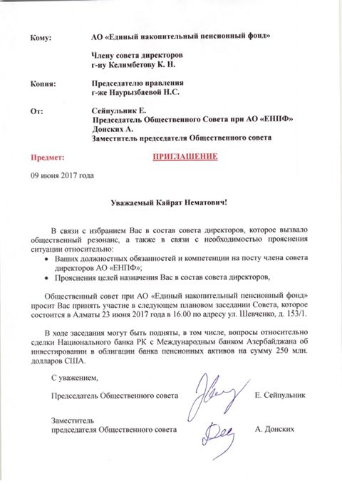 "В связи изменением состава совета директоров АО "ЕНПФ" и возникшими вопросами населения, 09 июня Общественный совет большинством голосов принял решение пригласить нового члена Келимбетова Кайрата Нематовича на очередное заседание, которое состоится 23 июня 2017 года. Указанное приглашение направлено адресатам", - сообщил глава Общественного совета при ЕНПФ Евгений Сейпульник.