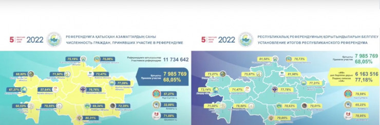 Напомним, 5 июня в Казахстане прошел республиканский референдум по поправкам в Конституцию. В бюллетене был всего один вопрос: "Принимаете ли Вы изменения и дополнения в Конституцию Республики Казахстан (Всего на референдум выносится 56 поправок. - Прим.), изложенные в проекте закона "О внесении изменений и дополнений в Конституцию Республики Казахстан".