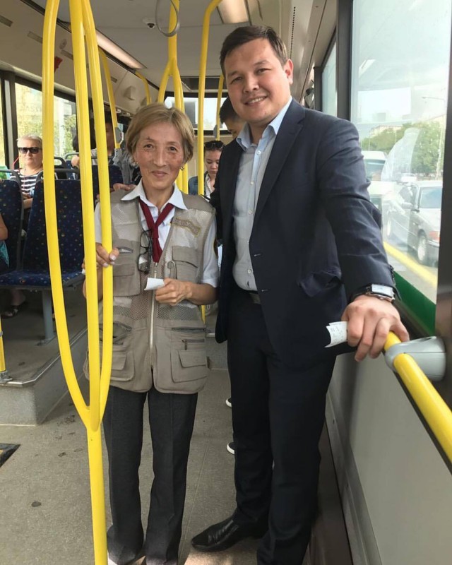 Эстафету от Ануара Жангозина, который ранее выложил селфи из автобуса, принял руководитель Управления по вопросам молодежной политики Асхат Оралов. На своей странице в Facebook он выложил совместную фотографию с кондуктором, сделанную внутри автобуса. По его словам, это был один из автобусов 25-го маршрута.