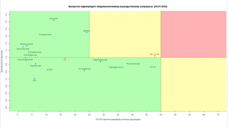 Один регион остается в "желтой" зоне согласно матрице оценки эпидемиологической ситуации в регионах Казахстана на 3 января 2022 года, передает корреспондент Tengrinews.kz.