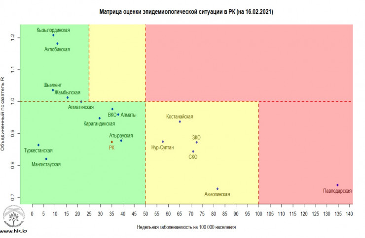 В "красной" зоне по коронавирусу, согласно матрице эпидемиологической ситуации на 16 февраля, остается только одна область, передает корреспондент Tengrinews.kz.