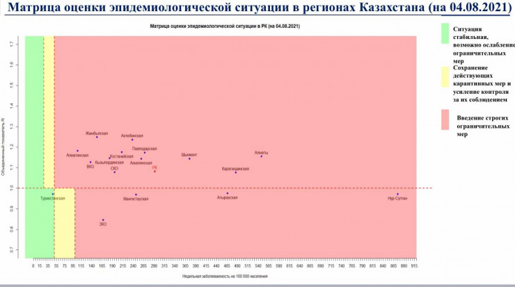 В "красной" зоне Нур-Султан, Алматы, Шымкент, Акмолинская, Актюбинская, Алматинская, Атырауская, Восточно-Казахстанская, Жамбылская, Западно-Казахстанская, Карагандинская, Костанайская, Кызылординская, Мангистауская, Павлодарская и Северо-Казахстанская области.