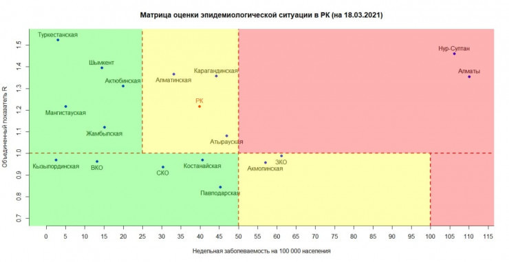Вчера, 18 марта, матрица оценки эпидситуации в Казахстане выглядела так: