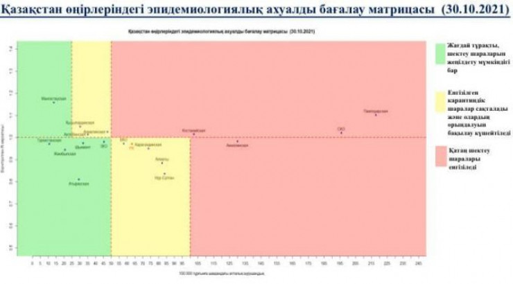 В "желтой" зоне: Нур-Султан, Алматы и Актюбинская, Алматинская, Карагандинская, Кызылординская, Восточно-Казахстанская области.