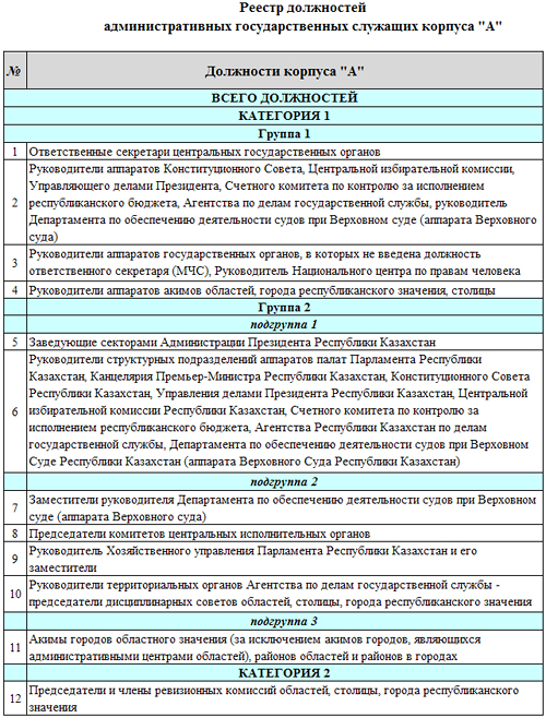 В списке можно посмотреть имя претендента и его категорию, группу и подгруппу, то есть на какую должность он стоит в резерве. К примеру: во второй графе напротив кандидата - Мамытбека Алмасбека Кенесбековича (ранее занимал должность первого заместителя председателя ЮКОФ НДП "Нур Отан") стоят числа 1-2-3. Это значит, что он относится к первой категории, второй группе, третьей подгруппе. То есть, зачислен в резерв на должность акима города областного значения (за исключением акимов городов, являющихся административными центрами областей), районов областей и районов в городах.