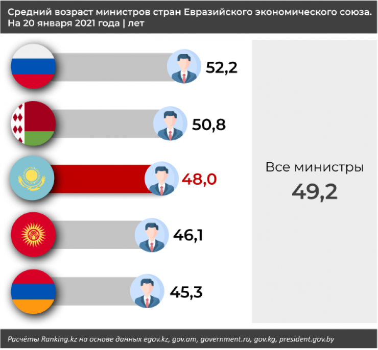 Компания Ranking.kz провела исследование, в рамках которого составила рейтинг министерств по возрасту министров. На начало 2021 года средний возраст министров стран Евразийского экономического союза составил 49,2 года, передает Tengrinews.kz.
